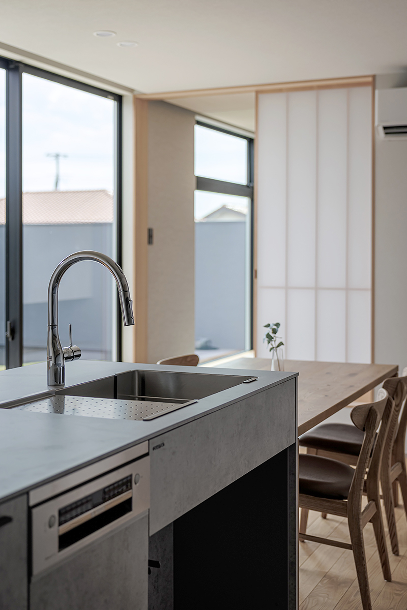 キッチンに立てば、心地よい光と緑に包まれながら料理を楽しめます。