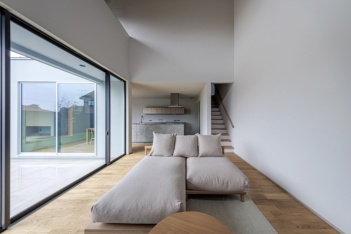 壁に囲まれた中庭に面したLDKは、プライバシーが守られた安心の空間。