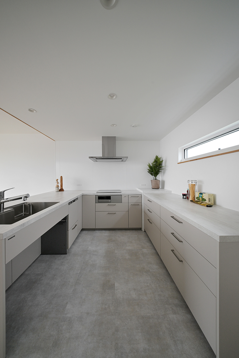 同色のカップボードを組み合わせ、コの字型にまとめた機能性の高いキッチン空間です。