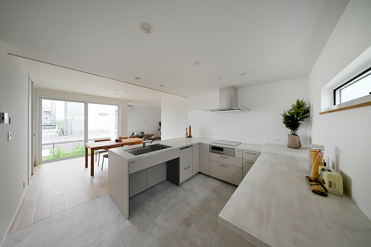 キッチンに立つと感じる上質感と、家族と自然に会話が生まれる開放感が魅力です。