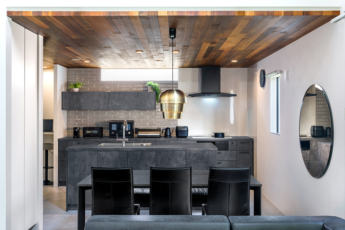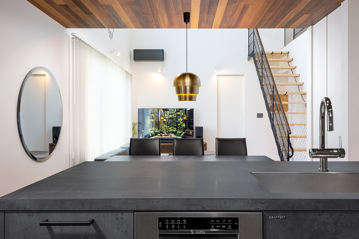 ゴールドのペンダントライトをアクセントに、家電はブラックで統一。
