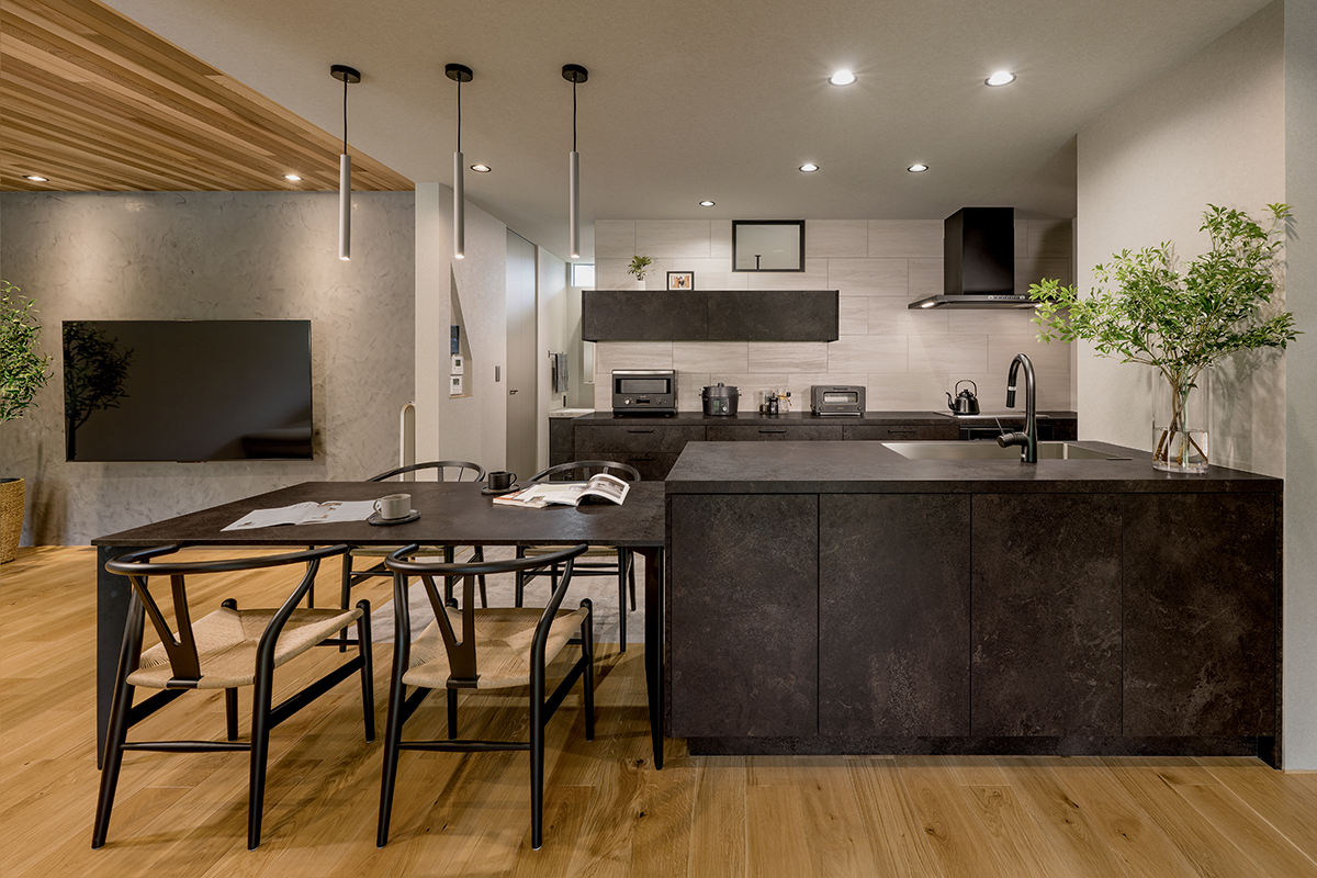 メルクリオの塊感が際立つ、重厚な色調で統一したキッチン空間。