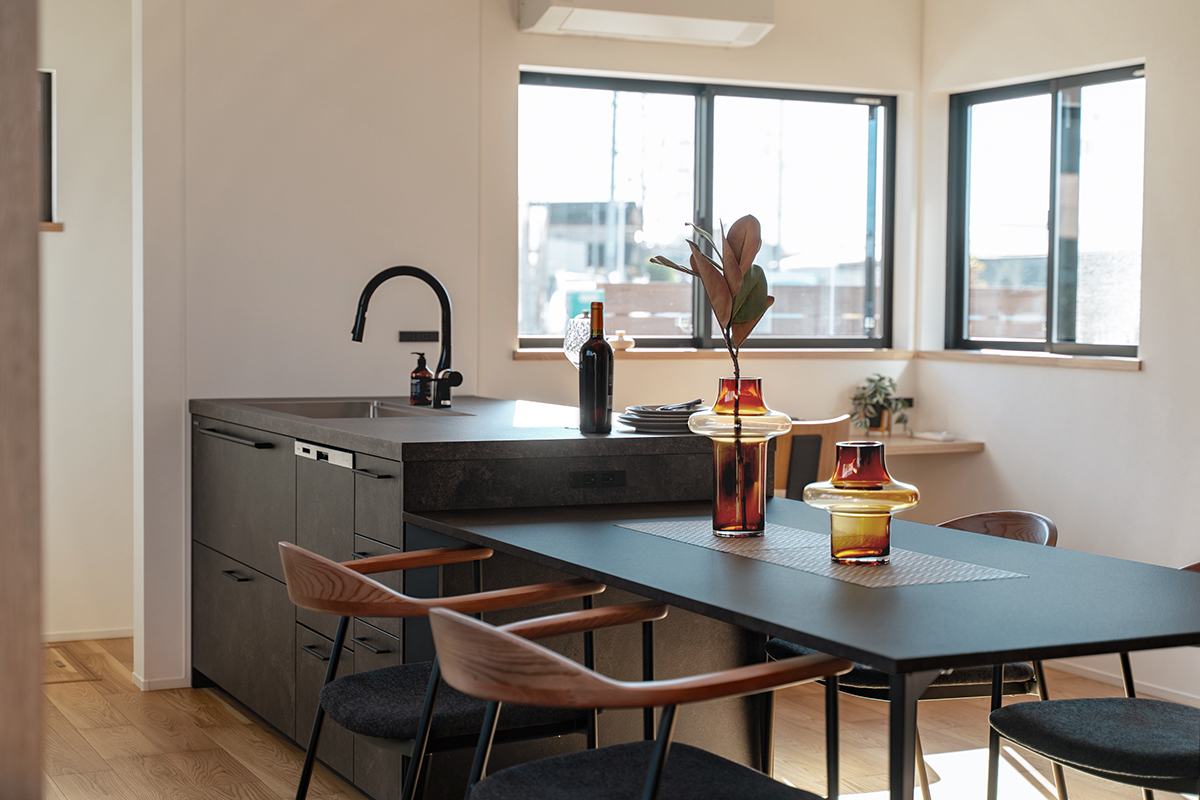 キッチンとダイニングを横並びに配し、自然と会話が生まれるレイアウトに。