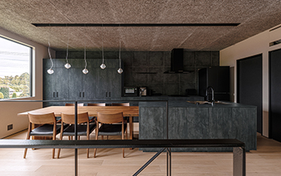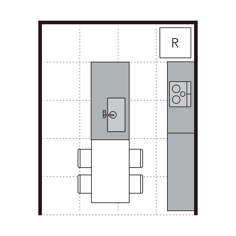 シンクをリビング側に、加熱機器を壁側に分けて配置することでコンパクトなアイランドキッチンを実現。回遊しやすく、複数人が行き交っても快適です。