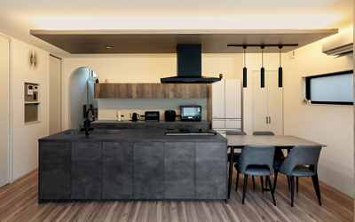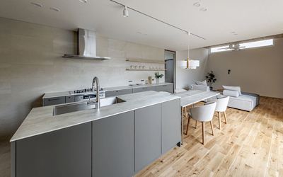 キッチンとダイニングが一体になったポポラートキッチン。広いワークトップは多目的に使えるので、ホームパーティや親子一緒に料理を楽しむ使い方もおすすめです。